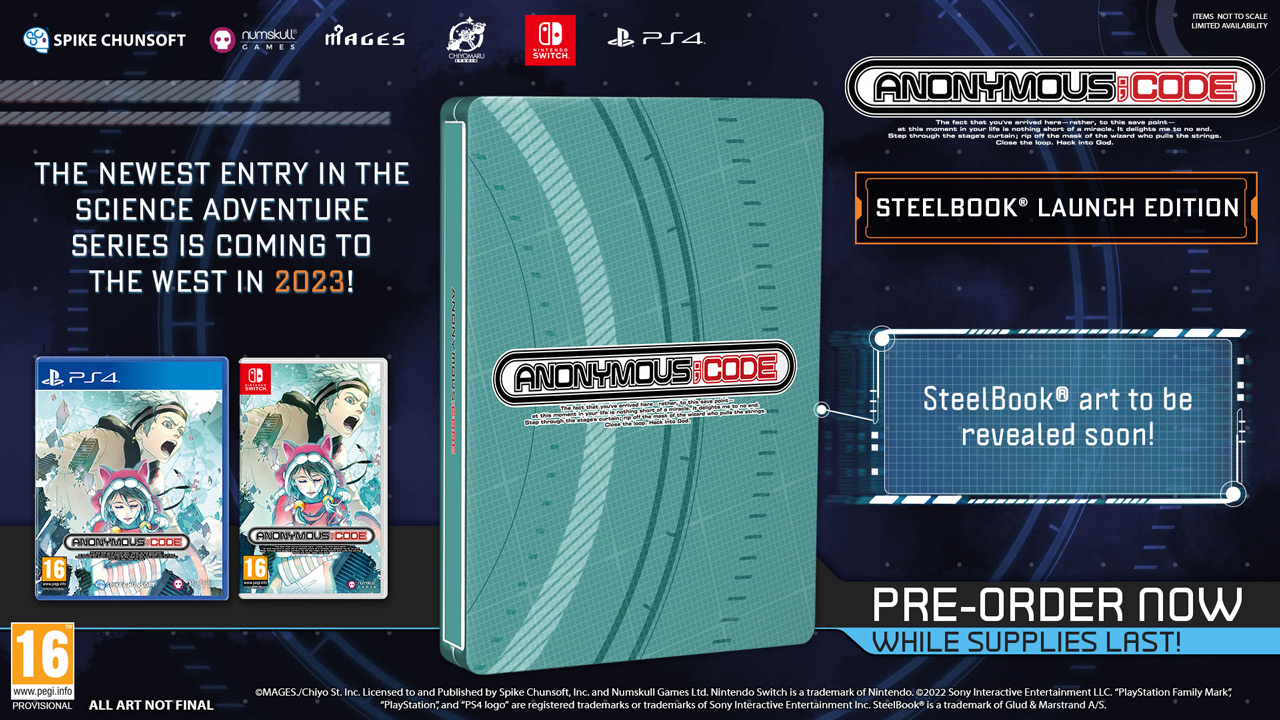 Anonymous;Code es una novela visual del creador de STEINS;GATE, Chiyomaru Shikura, en colaboración con el personal de Science Adventure Series. La edición física del juego incluirá una SteelBook, con un diseño aún por desvelar y la fecha de lanzamiento se comunicará próximamente.