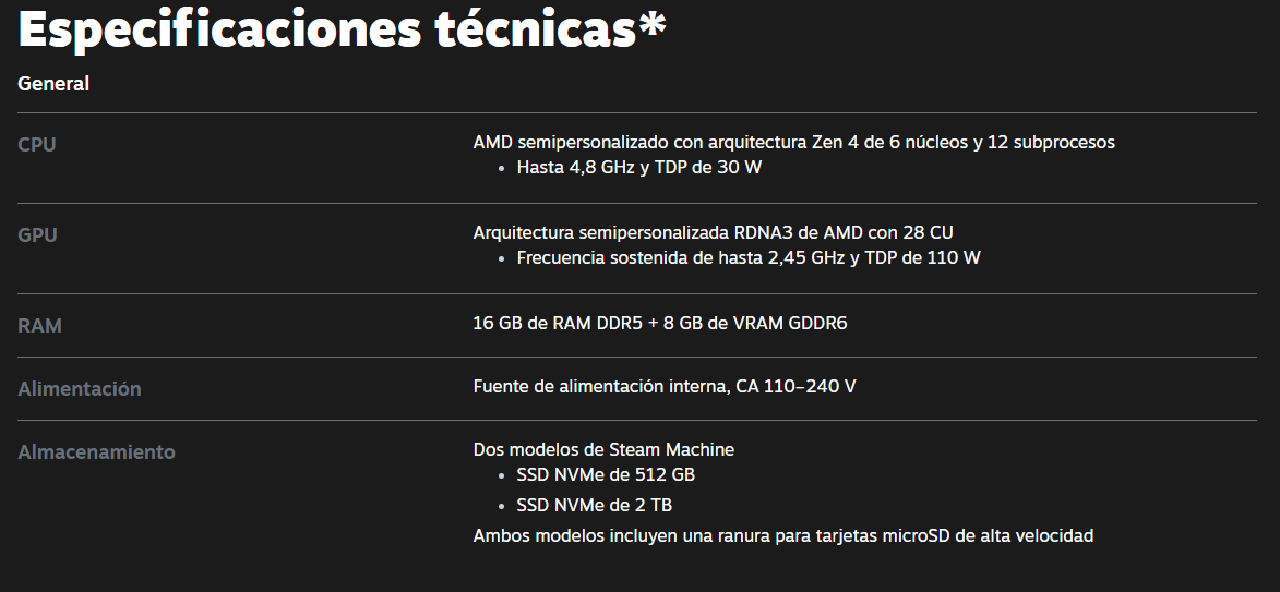 Pero Valve no quiere engañar a nadie. Desde un principio esta presentando las nuevas Steam Machine como un mini-PC, eso sí con una forma muy bonita que se asemeja mucho a una consola compacta de sobremesa…una Series X cortada por la mitad. Este PC-consolizado de sobremesa promete ser capaz de ejecutar toda la biblioteca de Steam sin complicaciones gracias a la integración de SteamOS3 y a su procesador AMD Zen 4 de 6 núcleos y 12 hilos capaz de ofrecer 4,8 Ghz, en la parte gráfica se apoyará en una GPU AMD RDNA3 y el conjunto contará con 16GB DDR5. En principio los de Valve no se mojan demasiado en cuanto a lo que esperar del equipo pero aseguran que se podrá jugar a 4k a 60 fps con soporte para FSR, HDR y FreeSync. Como guinda del pastel cuenta con toda la conectividad posible como HDMI 2.0, DisplayPort 1.4, USB-C y cuatro puertos USB-A, además de Wi-Fi 6E y Bluetooth 5.3. Con esta configuración de hardware estamos ante un dispositivo que se sitúa directamente por encima, por muy poco, de las consolas básicas actuales como PS5 y Series X. ¿Para cuando la veremos? Desde la compañía solo se ha adelantado con un escueto “a principios de 2026” y que llegará en dos versiones cuya única diferencia será el disco duro.