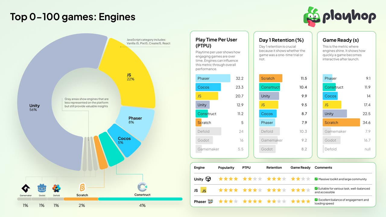 Por su parte los motores basados en JavaScript —incluyendo frameworks como Vanilla JS, PixiJS, CreateJS y React— ocupan el segundo lugar con 22 juegos en el top 100 y 153 en el segmento del puesto 100 al 1.100. Su ligereza y capacidad de carga rápida los convierten en una opción atractiva para juegos hipercasuales y de puzles.
